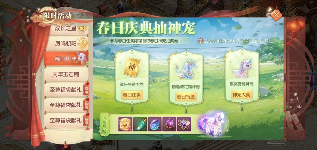 春日庆典抽神宠:做任务领春日神宠抽奖券,参与祈愿最高可抽非绑彩虹小马,全服终极神宠大奖全民开奖,奖券越多中奖概率越高,稀有奖励与神宠大奖两不误!